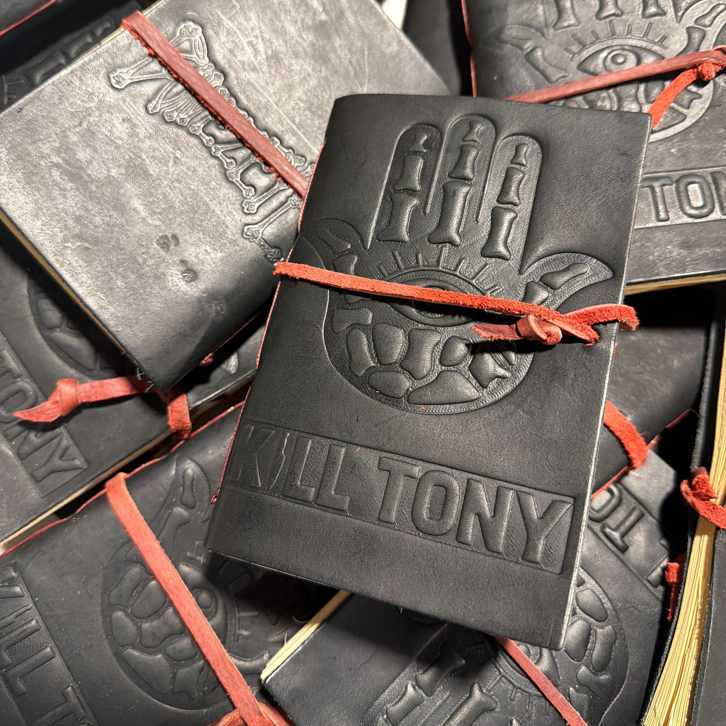 Take a stab at your comedic writing in your new Kill Tony joke book! Bonezeye's Kill Tony leather bound joke books harness that intention with a bundle of textured pages waiting to have ink spilled. Have a stab at it yourself and secure a book while this limited run is in stock.